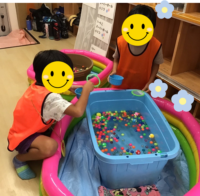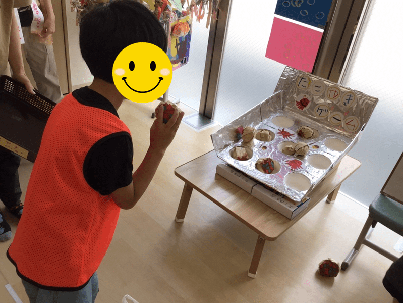 ボール入れ、大好きなドラえもんやアンパンマンの口やポケットへ向けてエィ!真剣な顔で狙っている子や、穴ではなく顔に当てて喜んでいる子、近づいて行って口の中を覗きながら丁寧に入れていく子など様々でした。
